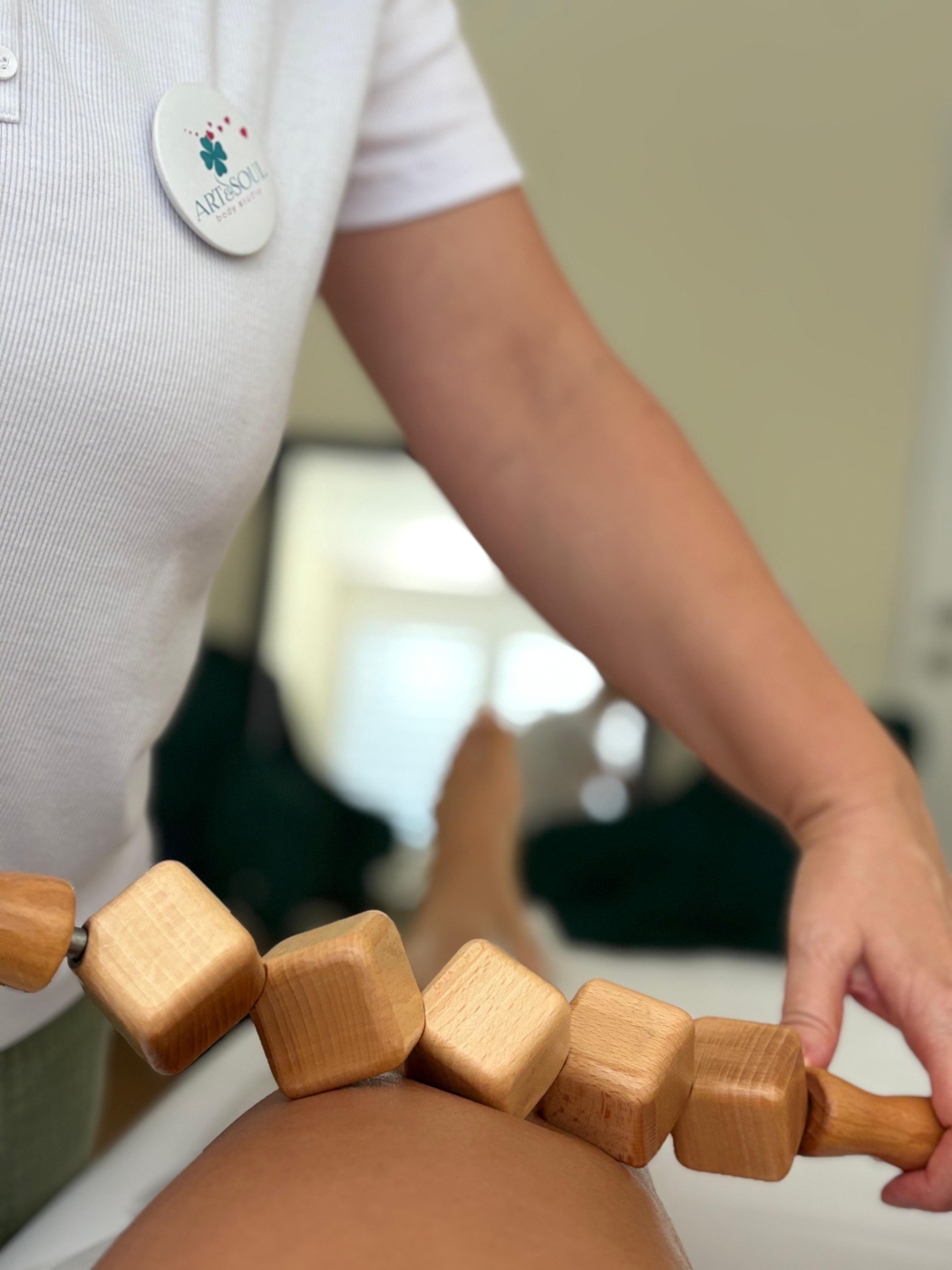 Mit speziell geformten Holzrollen wird das Gewebe gezielt stimuliert, um die Durchblutung zu fördern und die Körperkonturen zu verbessern.